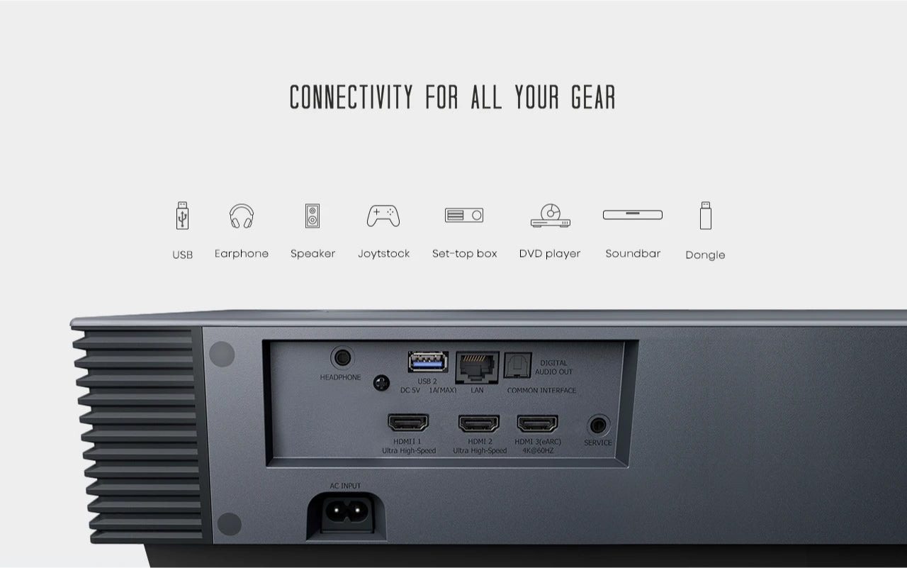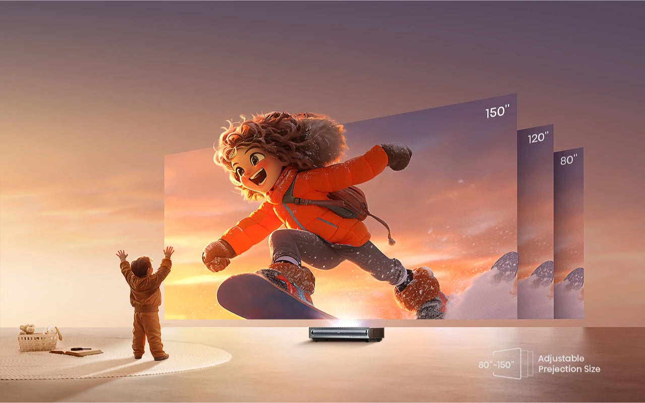 Thanks to the ultra-short throw technology, enjoy movies, TV shows, and games on a max 150″ screen without sacrificing space at home.