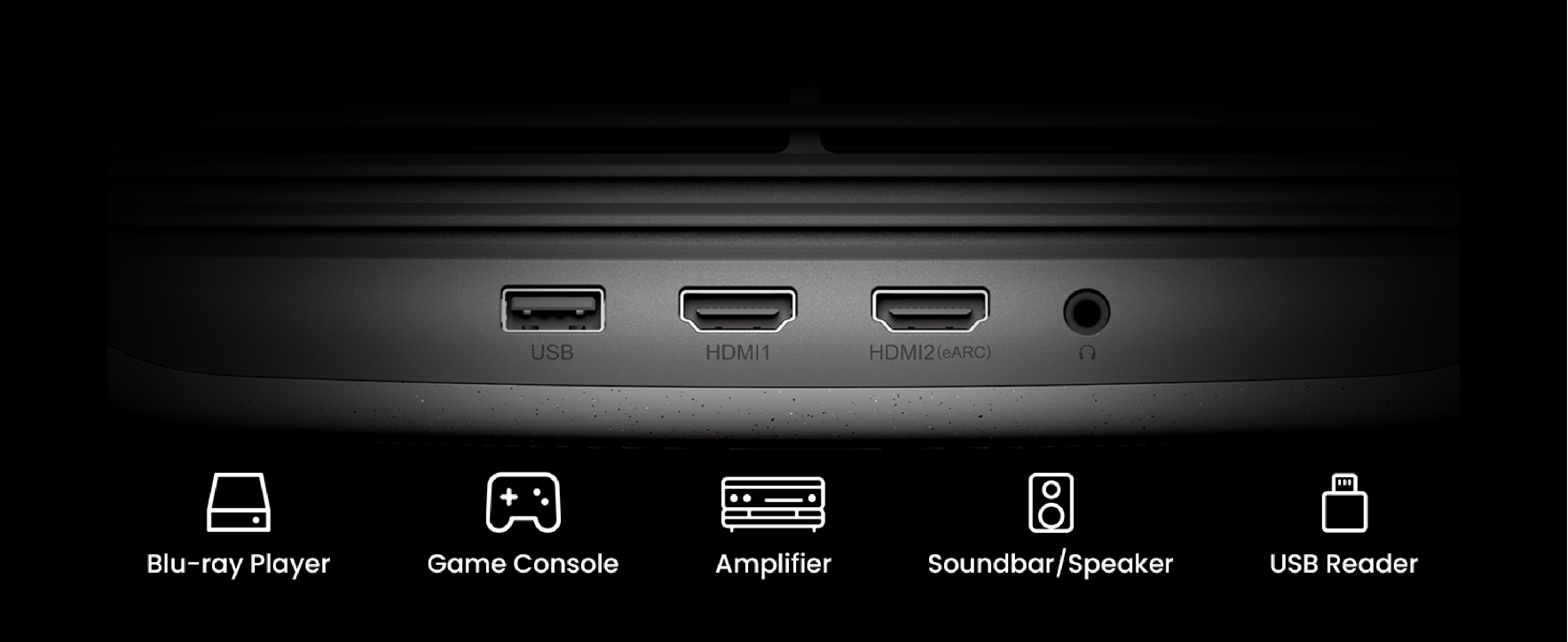 TWO HDMI 2.1 (one supports eARC), One USB-A 2.0, One 3.5mm headphone jack